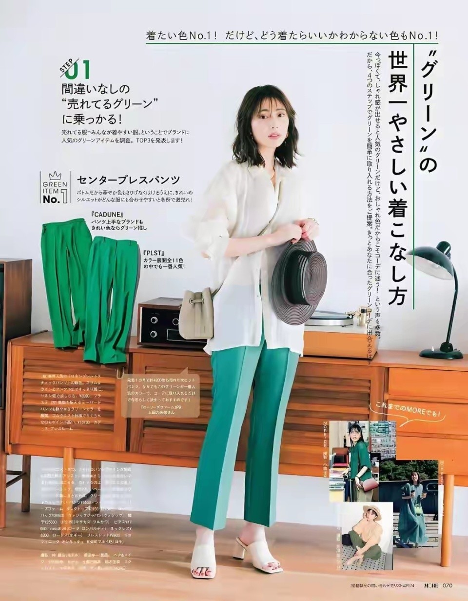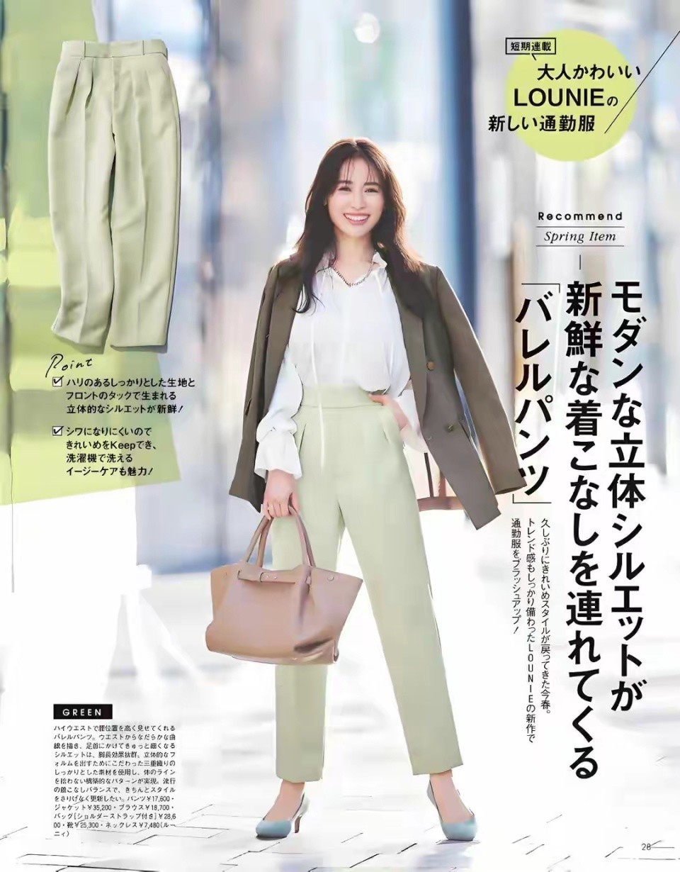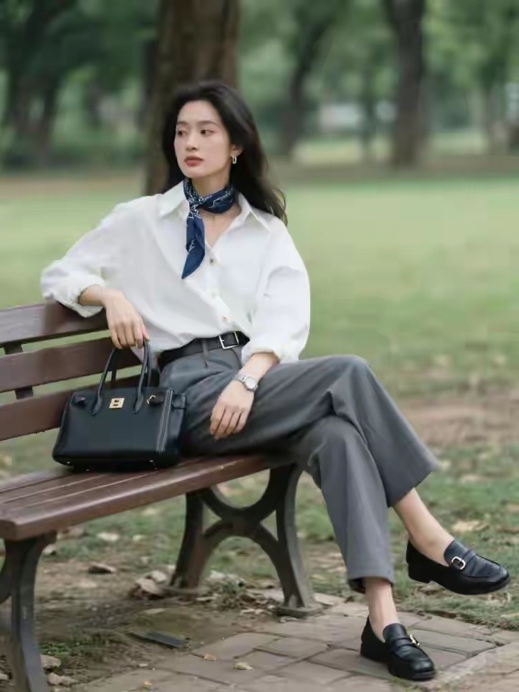 这还蛮推荐普通大众女性选择白色衬衫的,因为白色衬衫比较百搭,就算像下面这位博主一样,直接搭配上一条绿色的西装裤,看起来也不会有违和感,更不要说你选择最为基础的黑白灰,这样的西装裤来搭配了。