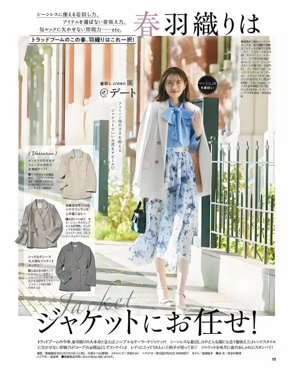也可以用白色的西装外套,内搭蓝色的雪纺衬衫和一条印花的半身裙,这样的搭配会更加的优雅。