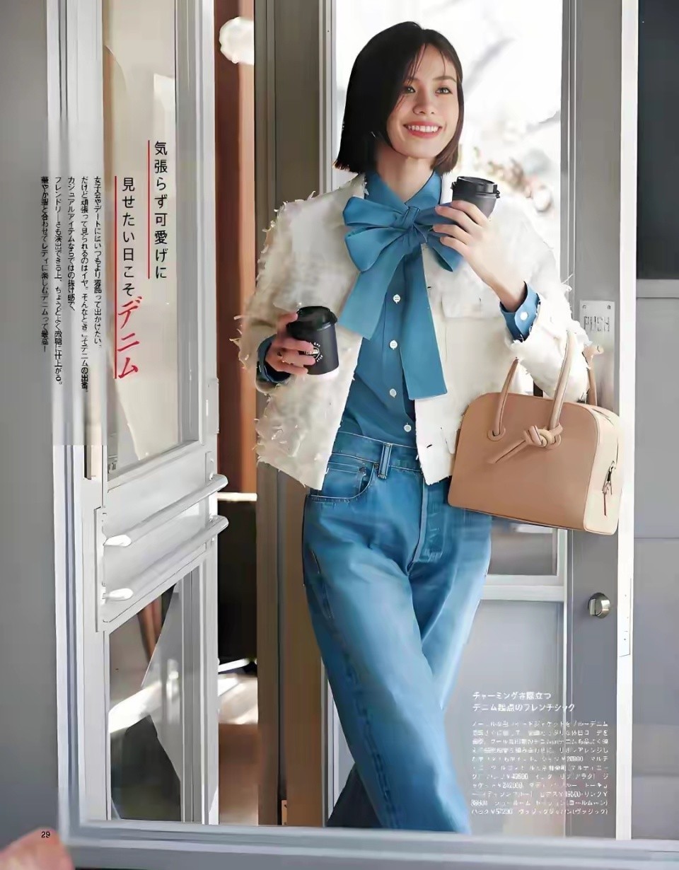 我们还可以用蓝色衬衫作为内搭,例如,下面用一件小香风外套搭配上蓝色衬衫和一条蓝色的牛仔裤,呈现出来的效果就很洋气,很精致。