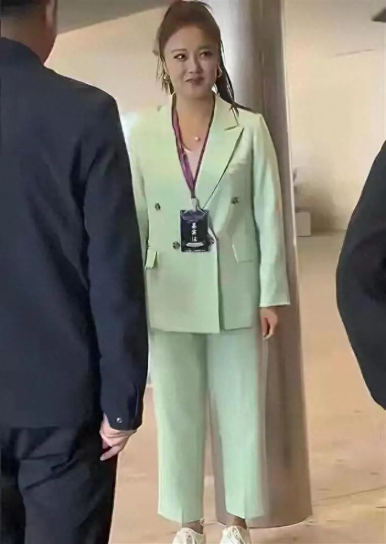 她那天穿了一身宽松的浅绿色西装,里面搭了件白色内衬,脚上踩了双厚底运动鞋。 头发还是那个标志性的高马尾,远远看挺干练。 但镜头一拉近,好家伙——脸圆了一大圈,笑起来眼角那个皱纹和法令纹,特别扎眼。