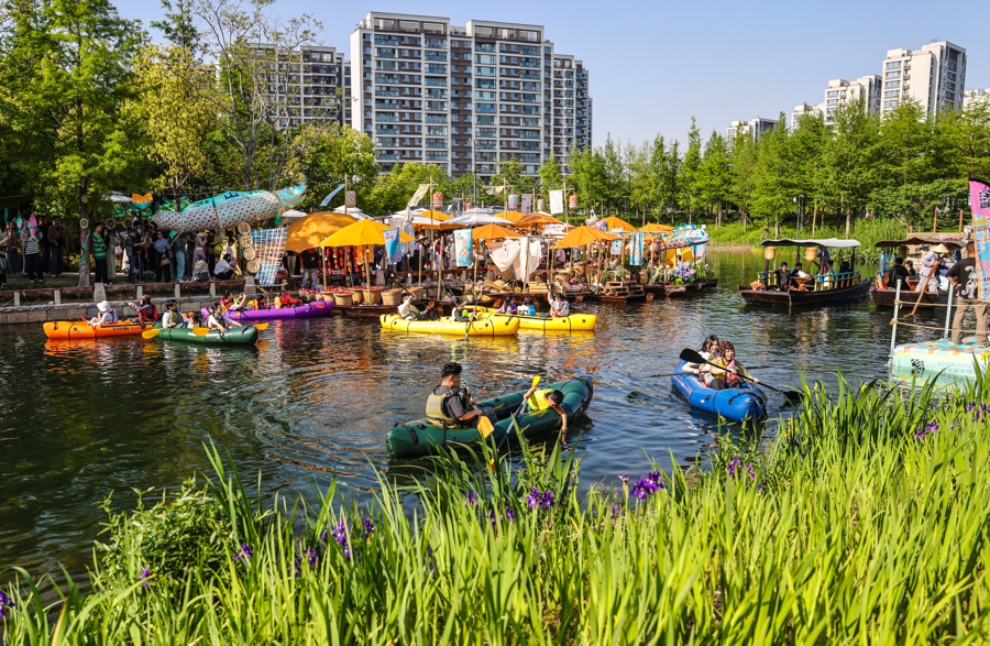 蟠龙因水而生,依水而兴。旧时四方乡民摇船载着江南产物汇聚于此形成集镇,如今循着“水市”基因,本届“江南风物季”依托蟠龙天然水系打造沪上首个水上市集。摇橹船载着江南风物穿行桥岸之间,再现江南米市、布市、鱼市的繁盛景象。市民可乘皮划艇“赶集”,或在码头边挑选风物好物、体验江南民风,感受“水上人家”的日常。水上市集既还原了蟠龙昔日“依水成市”的烟火气,更将现代生活美学融入其中,成就独一无二的沉浸式体验场景。