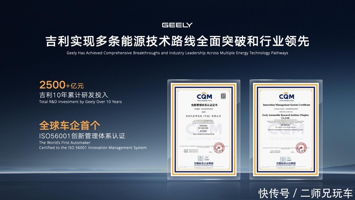 造车28年来,吉利汽车集团始终坚持能源多元化发展路径,在“两个蓝色吉利行动计划”指引下,已率先构建起覆盖纯电、混动、增程、甲醇、换电、高效燃油等多能源技术体系。凭借神盾金砖电池、雷神AI电混2.0、SEP浩瀚超级电混、绿色甲醇能源等一系列创新动力技术,吉利汽车集团在多条能源技术路线上实现全面突破和行业领先,与雷诺组建全球最大动力公司HORSE,向全球25家豪华及主流车企输出领先动力技术;搭载最强2.0T动力的星瑞TCR赛车,承袭领克7年9冠的荣誉,将征战世界最高等级TCR赛场,不断将中国动力技术推向世界舞台。近期,吉利汽车集团还荣获全球车企首个ISO 56001创新管理体系认证,标志着国际标准组织对吉利系统化创新能力的权威认可。