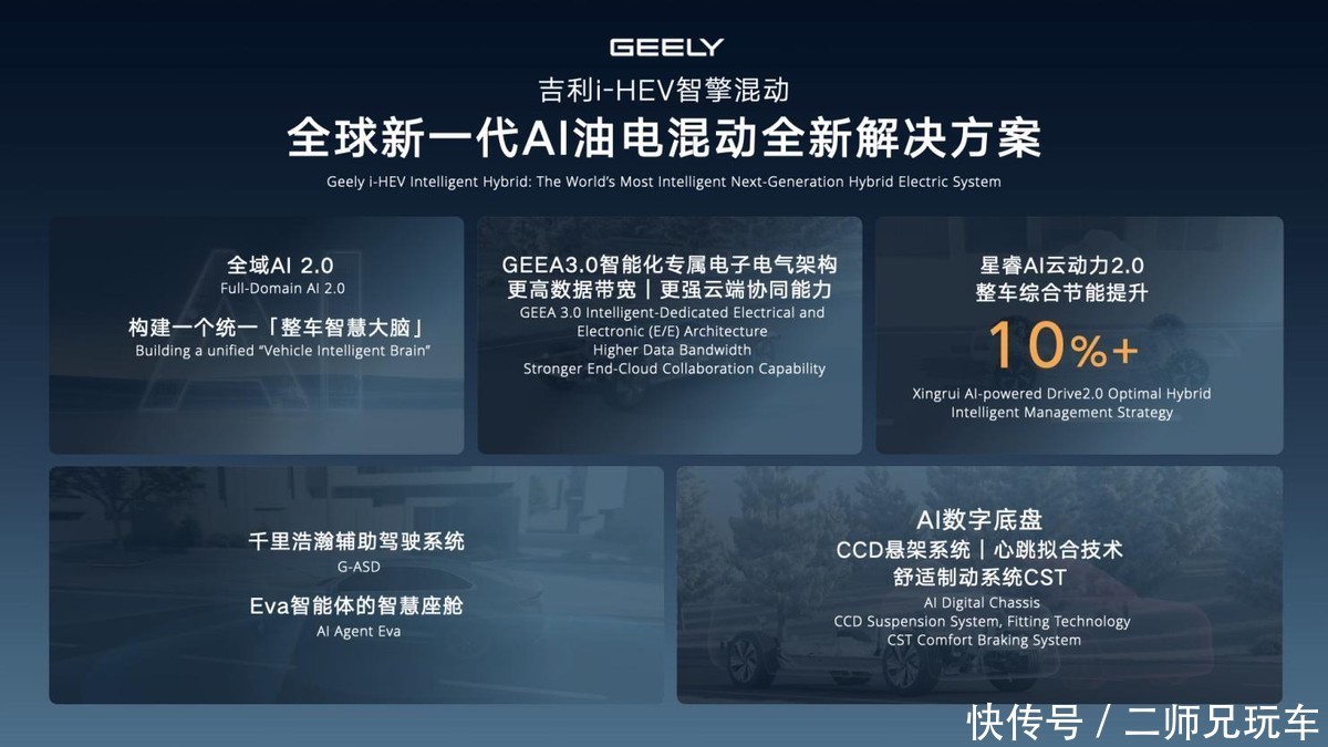 作为全球首个完成全域AI布局的车企,吉利通过全域AI 2.0对智驾域、座舱域、底盘域、动力域等各个域的感知、数据、信息的全面共享,构建了一个统一的“整车智慧大脑”。为了满足用户对油电混动“像电车一样聪明”的需求,吉利i-HEV智擎混动技术在全域AI 2.0赋能下,全面搭载GEEA 3.0智能化专属电子电气架构,具备了更高的数据带宽与强大的端云协同能力,颠覆传统混动的智能体验。