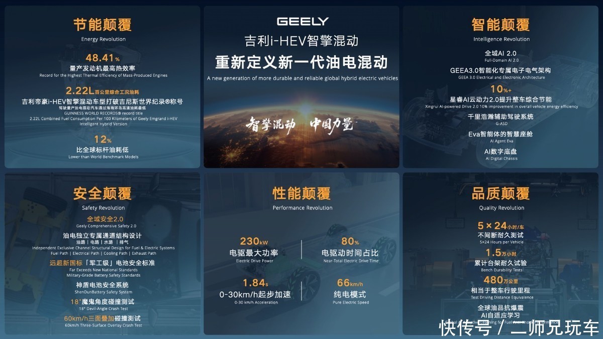 2026年4月13日,吉利汽车集团正式发布全球新一代AI油电混动技术方案——i-HEV智擎混动,以“五大颠覆”技术革新,重构油电混动出行体验,树立全球油混技术新标杆。该技术在吉利全域AI 2.0技术赋能下,深度融合全球顶尖的动力系统和行业前沿的三电技术,凭借低至2.22L实测百公里综合油耗、全球量产最高48.41%发动机热效率、首个HEV车型1级能效等,刷新行业多项纪录,全面颠覆传统油电混动技术。同时,吉利i-HEV智擎混动技术发布即量产,今年将率先搭载在星瑞、星越L、第四代博越L、第5代帝豪等多款中国星主销车型上,其中星越L i-HEV智擎混动和星瑞i-HEV智擎混动将于4月19日开启预售,让全球用户快速享受到新一代AI油电混动技术带来的更智能、更节能、更性能、更安全、更可靠的全新出行体验。